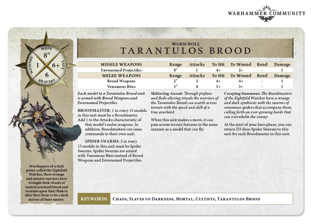 First, the spider boys. A very unique toolkit unit. At 110 points for 13 models they're reasonably priced but they do have to deal with mixed weapons as 3 out of every 10 models has a different attack. Mathematically it works out to the same, as the Hit is worse but the Wound is better, and they do double on attacks so it largely works out as a positive. You also get to bring back D3 Spider Swarm each of your own turns, giving them a bit of a survivability. Reinforce the unit and you get 6 spider swarms returning up to 2D3 instead dependant on the Broodmasters being alive. The non-spiders in the unit also get a short ranged attack, something that's a foreign concept to most chaos armies.