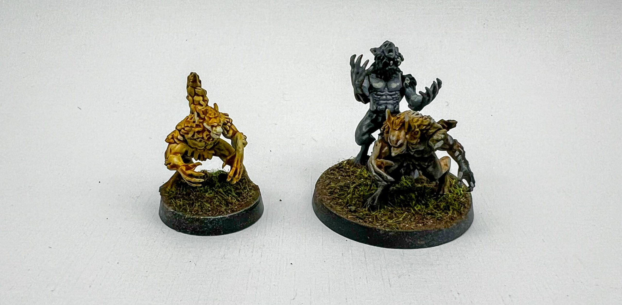 For the grey and black werewolf I used the Army Painter Warpaints Fanatic Black and Grey flexible triad, basecoating with Deep Grey and Matt Black, highlighting with Ash Grey and then switching to the warm gray triad to do a final highlight with Brainmatter Beige that I repeated on the brown werewolf to give everything a cohesive look. The brown werewolf is a mix of Vallejo Express Mahogany and Battledress Brown, as I wanted to try out some dark colors on the models. Everything was then based with a layer of Turned Earth Ground from Ammo by Mig and some Pine Forest Ground Cover from Luke’s APS.