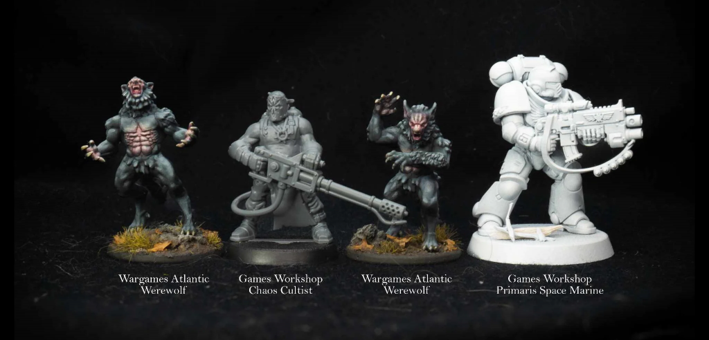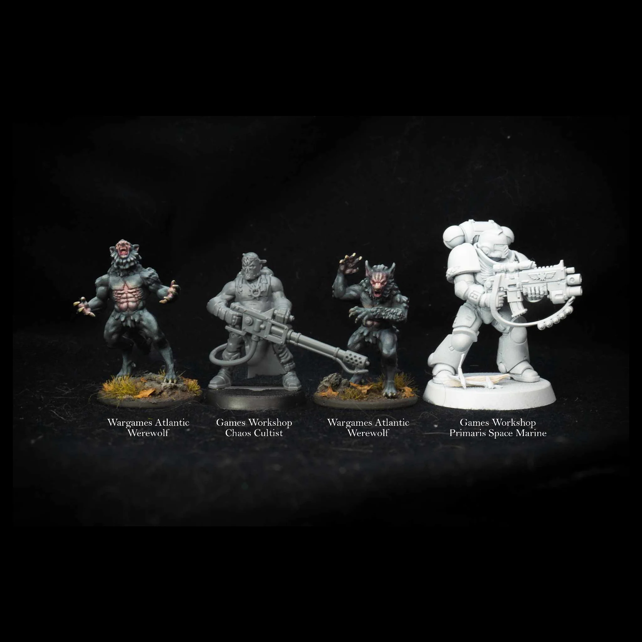 The werewolves scale very well with traditionally-sized, more “realistic” 28mm models. They’ll look small next to a space marine, but look great with historicals, a lot of non-GW army lines, and RPG models. More on this later.
