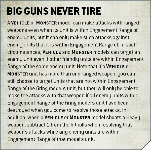 Quite a few things. Some are inherent to tanks and monsters; others are things that have changed in the game that will affect them. Tanks being able to shoot in combat is the biggest thing, as Vehicles and Monsters in Engagement range of enemy units can choose to shoot their weapons at models within Engagement range and can also declare shooting out of combat (see our Ruleshammer post on this for more details). There are some restrictions, such as a -1 to hit penalty when shooting heavy weapons against targets in engagement range. Blast weapons also cannot be used against targets within Engagement range.