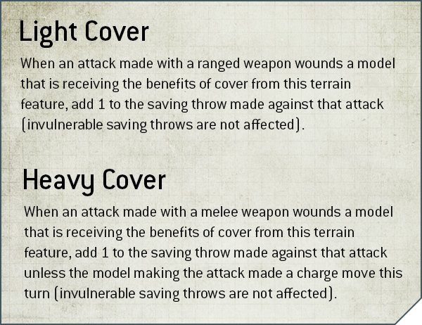 - Obstacles (barrier, walls) - offer cover, which will usually mean +1 to saving throws against ranged weapons for INFANTRY, BEASTS, and SWARMS if the obstacle is between you and the firing unit