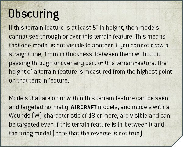 - Obscuring: If terrain is more than 5" tall then it blocks Line of Sight even if you can physically see through it. The footprint blocks LOS.