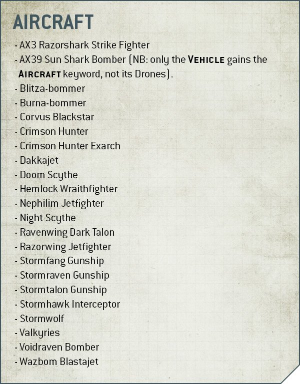Aircraft have a host of new rules associated with them. A lot of these focus on movement and are refinements of the FAQ rules, but one major change is that Aircraft can move off the battlefield now and return later on. We now know how that works - They return to the table as