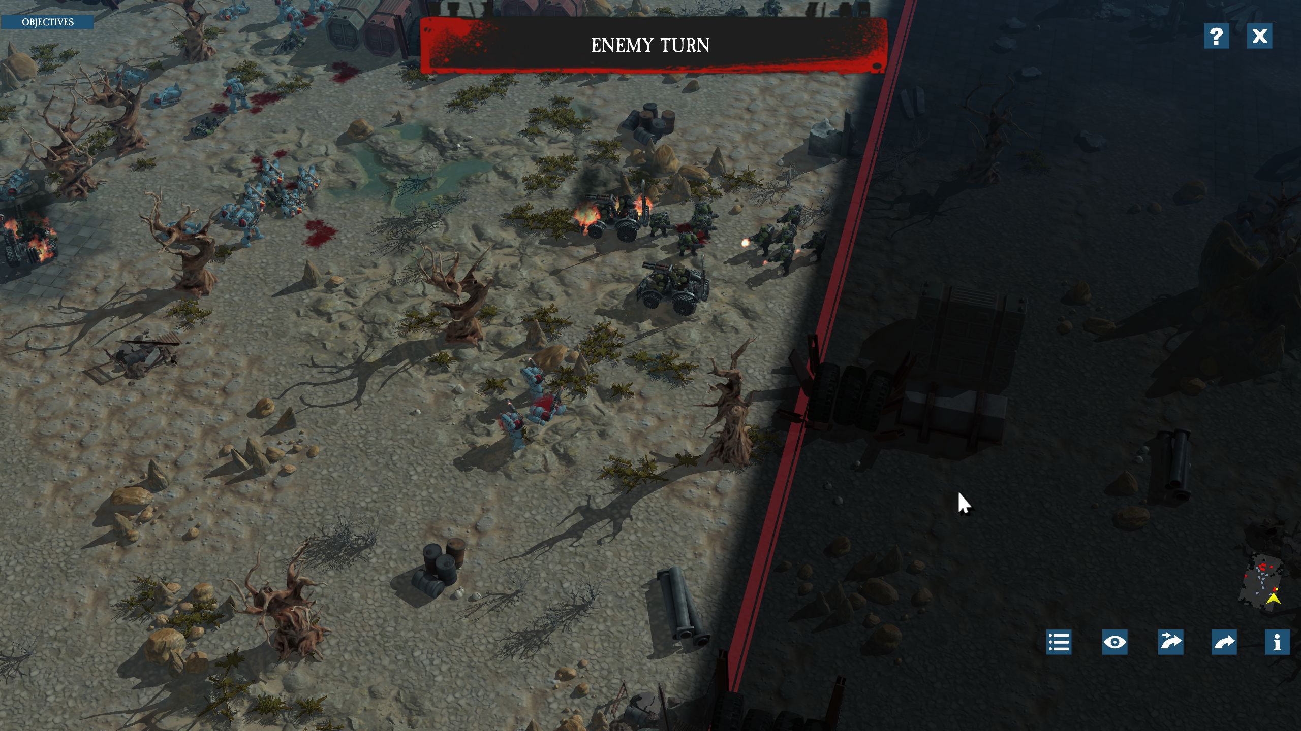 The tactical maps themselves are a slog; they’re either generated from pre-created parts or there are a lot of bespoke, very boring maps in here. They’re very cluttered and terrain is very difficult to destroy; some of this is flavor-appropriate, fine, but Space Wolves as a faction need space to stretch their legs, move quickly and get in close. You get Land Raiders and bike-mounted units specifically for this. And yet unless it’s an escort mission -- yes, this game has point-to-point escort win conditions; yes, they’re as irritating as that sounds -- half the map will be covered in rough terrain and features that block mobility, line of sight, or both. “Half the map” is a slight exaggeration but not a huge one; they really went to town on some of these boards. The boards themselves are also very small to encourage bite-sized fights, but since the computer isn’t constrained by a points-built army size like you are and can just deploy units in from the map edge on a regular basis, it mostly leads to you feeling claustrophobic and out of position at all times.