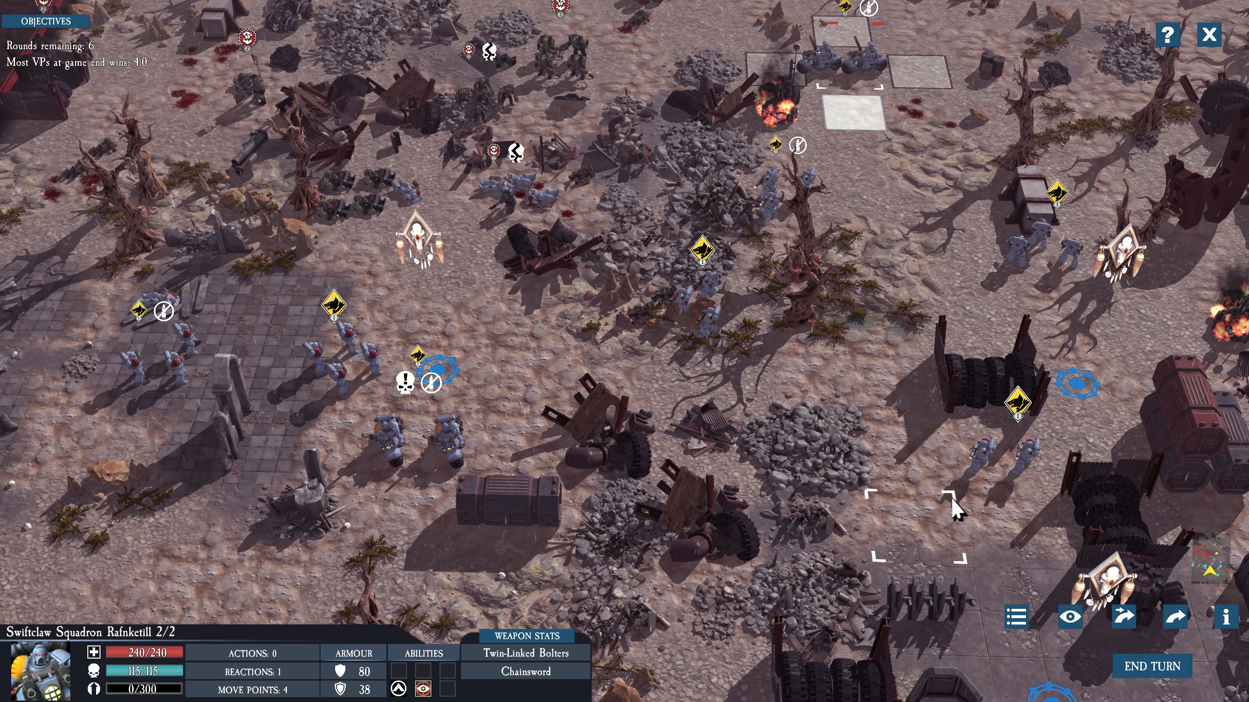 We’ll start with the positives: In 2017, this was about the best you were going to get if you wanted to play a 40K video game that kinda-sorta felt like 40K. There were a bunch of mobile games out there, one with Deathwatch branding, a couple with Space Hulk, and a Battlefleet Gothic mobile game timed to drop with the real-time strategy Battlefleet Gothic: Armada title, but in terms of an actual for-Windows game with turn-based tactical gameplay where your little mans walked across a map to shoot the other guy’s little mans, this is about it. It does not appear it was ever released on mobile, which is a surprise since the UI/UX is extremely touchscreen friendly, with helpful buttons to press everywhere and a lot of click to select/click to place/click to confirm workflows instead of dragging things or using right mouse button inputs to change behavior (instead, right mouse button is the universal “de-select what you have selected” input). This stuff is fine, as far as it goes, though if you’re used to how most PC RTS and turn-based tactical games handle mouse inputs, it takes some getting used to.