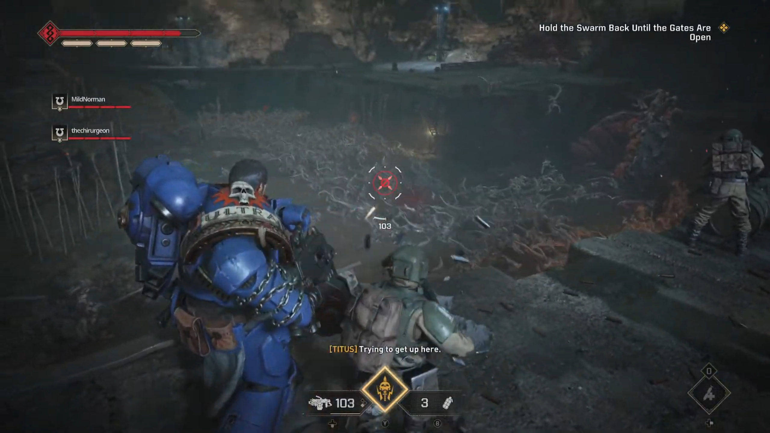 The PvE mode, however, I’ve had nothing but good experiences with. It's a three person mode; while you can play offline with bots, the game informs you that it will reset any progress you make while doing so, and clearly wants you on the servers engaging with other players while serving the supporting elements of 2nd Company not under Titus's direct purview. As that suggests, the missions are story missions -- if you decide to just jump into PvE roulette, you'll get mild spoilers about how bad 2nd Company is at not fucking the entire pooch. There’s a computer regulator -- a very simplistic dungeon master, basically -- that looks at what you’re doing, how you’re doing it, what your level is, and it fucks with you based on that. If you’re really good, they’ll send more. If you’re really bad, they’ll wait until you heal up, and then they’ll send more. You’re facing Tyranids and a Chaos-corrupted Hive World, you’re not going to ever be facing less. But the encounters are regulated, which is very interesting; you can see this mechanic talking to you in the ticker across the top of the screen during Operations. The PvE missions are all plot-relevant for the campaign, too, which is a lot of fun. But you can play them out of order if you don’t care about the plot, which is how a multiplayer mode should work at the end of the day.