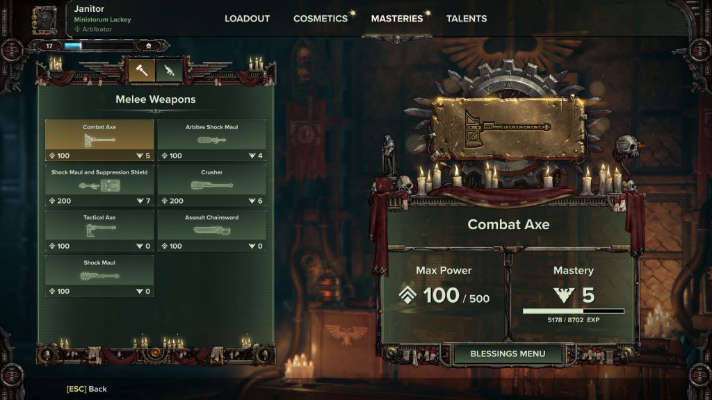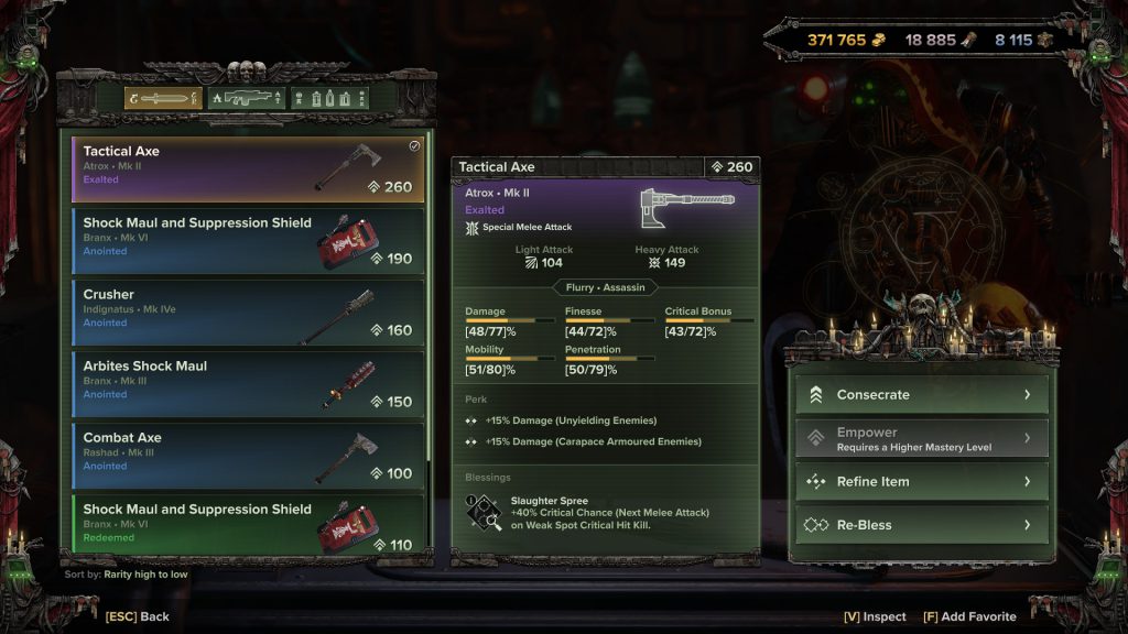 Gear progression has been overhauled and refined. Before you would spend time and resources constantly playing the Holy Slot Machine to roll a weapon with stats you like, and then re-roll again for blessings that were optimal to your build. There's no need for that any more. (Thank the Emperor- err, Omnissiah.)