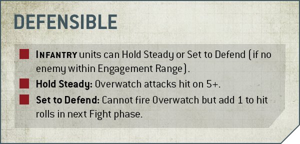 - Set to Defend: You can't fire Overwatch but you get +1 to hit rolls in the next Fight phase.