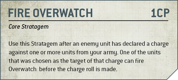 This has a few major consequences! The first is that Overwatch costs CP to use, making it a much more expensive action to undertake, and something you'll often just not bother with if the best-case scenario is just dealing an extra wound or two. The second is that it limits you to using Overwatch once per Charge phase, meaning that if you've got multiple chargers you can cleverly work out your actions to prevent an opponent from using the Stratagem.