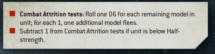 Combat Attrition. When you take a Combat Attrition test, you roll a D6 for each model in the unit and on a 1, a model flees. You get -1 to these tests if the unit is below half strength.