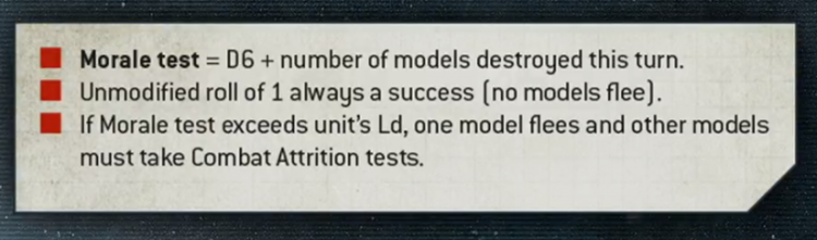 Discussed on stream, Morale sees some large changes as well. You're still taking tests based on D6 + the number of models destroyed this turn, but now unmodified rolls of a 1 always succeed and if you fail the test by going over your Ld value, one model flees and you have to take