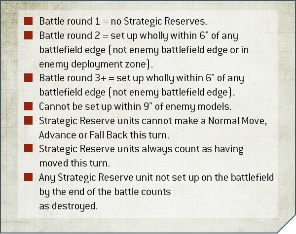 A new addition to the game's rules, Strategic Reserves add an extra tactical dimension to gameplay by giving any army an option to outflank units instead of deploying them normally (units that can teleport, tunnel, infiltrate, or otherwise deep strike can just do their regular thing - they aren't affected by these rules).