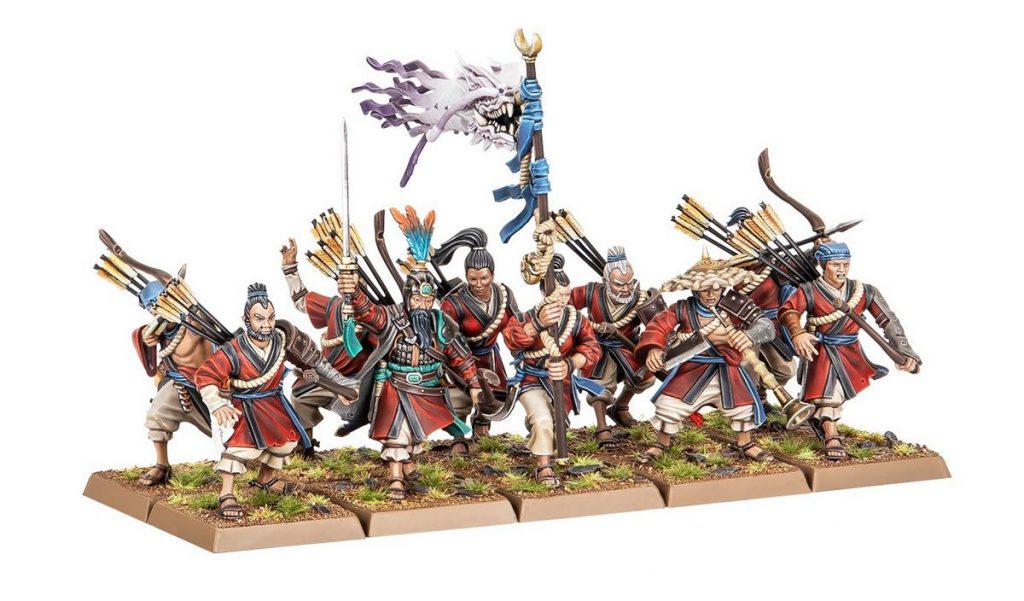 Peasant Levy. Peasant Levies represent the great hosts of farmers and standard citizenry of the empire of Cathay that are trained to some martial degree throughout their lives in order to take up arms in defense of their homeland in case of emergency. This unit is extremely cost effective (perhaps too cost effective, 1 more point would not have hurt) and just what Cathay truly needed when it comes to putting together a balanced list. Sitting at a paltry 4 points per model, with a base unit size of 10+, Peasant Levies feature the standard human stat lines we've kind of come to expect with a WS of 2 and BS, Str, To and Initiative of 3. They are base leadership 5 (6 when fielded with an Elder, their champion equivalent) and may be equipped with either Warbows or Long Spears at no extra cost.