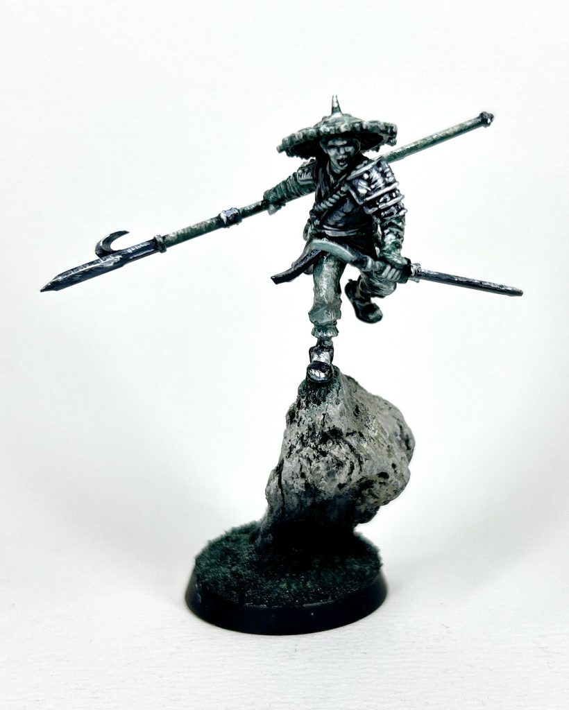 One way I thought of to mix it up would be to drop the kneeling guy altogether on some of them. So I used a rock (bit of wood) to prop up a shield and took the kneeling guy to make a very stoic looking halberdier. Using a Halberd from the Jade Warriors he really looks like he’s braced to receive a charge from cavalry. A whole front rank of these in your Jade Warriors would look really impressive.