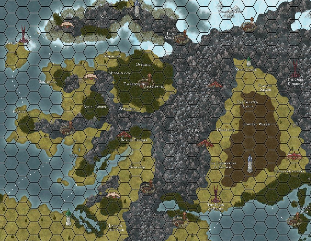 So, using some map making software a friend recreated a section of the Old World for us to fight over. You'll notice a bunch of places you'll be more than accustomed to with the lands of Men with the Empire and Bretonnia well covered, but we're also heading a little to the west with the mountains and the lands the Ogres call home being included. We've also got the frozen wastes of the north and just to the south the dead lands of Khemri await, so plenty of room to fight over for sure.