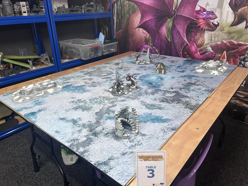 So what does a standard Old World table look like? I've borrowed some terrain pictures from a recent event I went to at Patriot Games in Sheffield (UK) hosted by the Wondering Warlocks, which are a small group of event organizers putting on regular events. The below tables are all differently themed, but all contain the "same" terrain setup, just laid out differently.