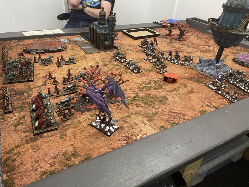 The last scenario I want to talk about is the one shown in the photo below. We have a Chaos Army running longways into an Empire Gunline. The Empire Army has two Hellblaster Volley Guns and three Cannons. The wood feature can't be used to hide from the Cannons (as they target a point in the wood, then hit the dragon on the bounce) but it can be used to shield the Dragon from the Hellblasters. When approaching the game from deployment, the Dragon was deployed over on the flank with this in mind. It's not really about the protection he'd get from the terrain on deployment but more where the terrain would hlp him when it mattered, either in the Empire T1 or T2 shooting phases depending on how quickly the dragon made it up that flank, if magically assisted.