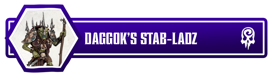These aren’t Daggok’s Block-ladz, so let’s see how well they can stab. Daggok himself has the typical “leader profile” with his weapons at R1/H2/D2 and R2/H2/D1, but inspiring grants him an additional attack dice