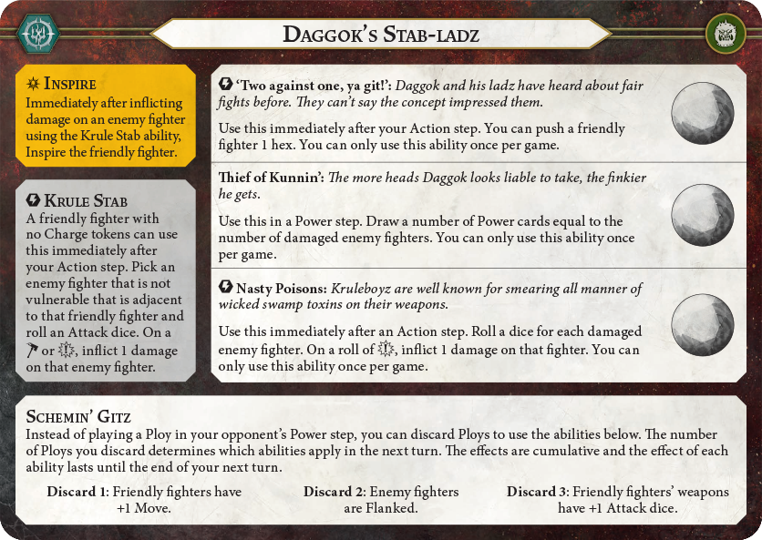 Schemin’ Gitz is an interesting ability for sure. I like this take of their scheming ploys from the previous edition. Essentially, every ploy in your hand has two functions. You can either play them as they are printed, or you can discard them to fill up this Schemin’ tracker for +1 move, counting enemies as surrounded, and getting +1 attack dice. The flexibility here is appealing, and they will never had a dead ploy in their hand – worst case, it can be turned into a movement boost or accuracy buff. I don’t feel like it’s going to get used all that often because it’s a steep cost just to get +1 move, but the ability to have it on demand any time you want is strong. This is the kind of ability that will scale up very nicely if any decks come out with substantial card draw in them.
