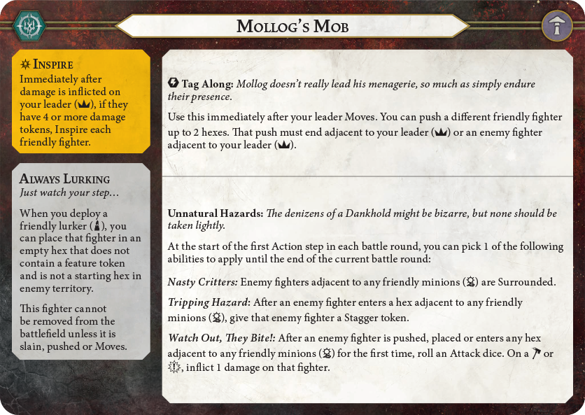 This warband is incredibly focused on Mollog himself, to the point that the inspire condition for all the fighters is based on how much damage Mollog has taken. Once he reaches 4 damage taken, the entire warband will flip to their inspired sides.