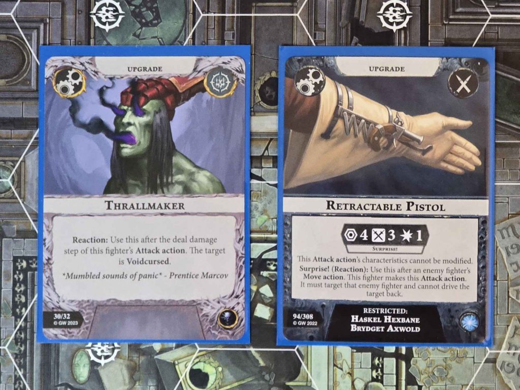 I won’t go too deep into the details of this match, but I can pinpoint the exact moment that Chris’s spirit broke. In the second round of the first game, Chris only had Domitan left on the table. I had realized how powerful Voidcursing his fighters would be, so I had stacked a nasty little one-two combo on my leader: Thrallmaker and the Retractable Pistol.
