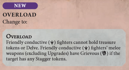 Coming in hot, the Exiled Dead aren't even out and have already received a nerf. This warband had unparalleled action economy with Danse Dynamic – being able to move 4 fighters at once (and resurrect one that was slain afterwards) allowed some disgusting plays with feature tokens. Now those same conductive fighters can't delve or hold treasure tokens, so they're going to have to Danse elsewhere. Likely into combat which is still a frightening thought, especially when you consider they can take advantage of a double-plot pairing like Edge of the Knife and Deadly Synergy.