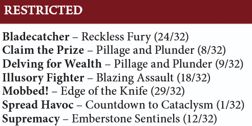 The only update to the Forsaken and Restricted list was the inclusion of Claim the Prize. Pillage and Plunder is now the only deck to have two restricted cards, both of which are pretty solid surges. I'm not crying over this because despite Pillage being an interesting deck, it's also been played to death and I'm frankly sick of seeing it. Effectively, this is probably just banning Claim the Prize because Delving for Wealth is going to be the easier card to score most of the time. It also makes pairings of Pillage and Plunder with any other deck that has a restricted card a little more difficult which is fine by me.