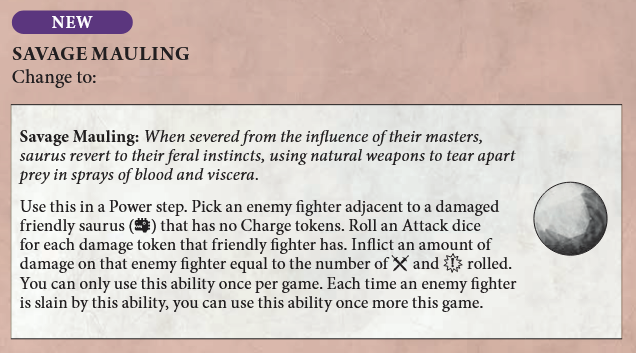 Pretty small change here and if you squint, you might miss it. The previous wording was dealing 1 damage X times where X is the number of successes rolled on the dice. This would be individual instances of damage that interacted weirdly with a few abilities, namely their inspire condition. Now it's just a lump of damage dealt at one time. Technically it's a small nerf to their inspire, but also allows this ability to actually kill a fighter equipped with Unstoppable from Wrack & Ruin.