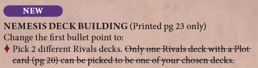 Next up is an exciting change for the Nemesis format. No longer are you restricted to only picking a single deck with a plot card. This doesn't open up a
