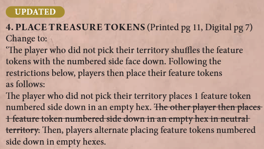 The first change not only reverts the token placement change from the Spring 2025 update, but it fully removes the requirement for a treasure token to be placed in neutral territory at all. All of the other old restrictions still apply – they can't be in starting hexes, blocked hexes, stagger hexes, edge hexes, or within two hexes of another feature token. If it's otherwise impossible to place one, they can be placed in an edge hex. And finally, there must be at least one treasure token in each player's territory after the last one is placed.