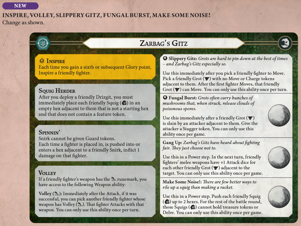 Finally, Make Some Noise! adds a familiar restriction to the squigs after it's used. For the entire remainder of the battle round, neither squig can hold treasure tokens or delve after they're pushed. The two squigs retain their ability to be deadly meat missiles worth 0 bounty, but they can't be used for cheeky feature token antics. This feels reasonable because you still have seven whole other fighters who can double move that still can.