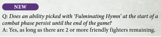 The previous rules update changed a rule saying that unless otherwise specified, abilities won't end. This FAQ carries that same ruling forward to the Fulminating Hymn ability of the Brethren. Feel free to keep singing and singing, stacking up those buffs each round!
