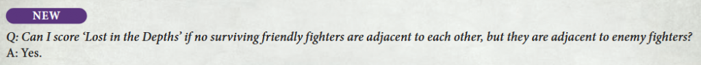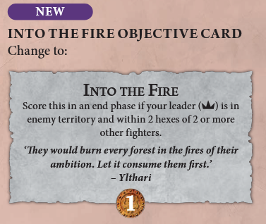 The addition of "or more" to the end of this objective makes it a lot less painful to score. Technically, the previous version required your leader to be in range of exactly 2 other fighters – if there was a 3rd nearby, you couldn't score it.