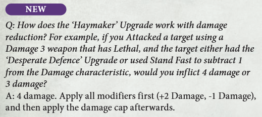In an appropriate double whammy for this deck, Raging Slayers also has an FAQ for how Haymaker works. This upgrade has had a few questions crop up during gameplay due to its' damage cap, and this question helps outline not only how this specific interaction works but (hopefully) answers most other questions about how the Lethal ability granted from Haymaker interacts with other modifiers.