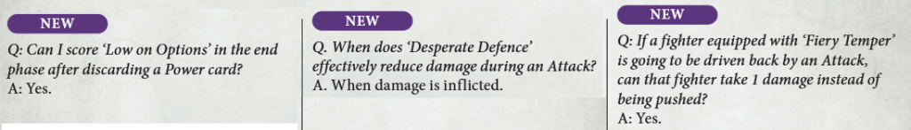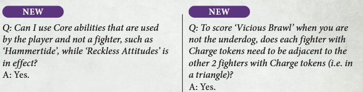 Good ol' Reckless Fury. Nothing beats Reckless Fury. This deck has been reigned in to be less of a problem than it was during release, but it still has a few new questions pop up here. Reckless Attitudes constantly puzzles some players, so seeing more answers here is probably ultimately good for the community. I also appreciate the continued use of the "triangle" explanation for adjacent fighters.