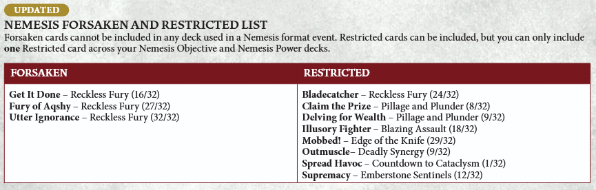 Outmuscle from Deadly Synergy has been added to the collection of restricted cards. This 2 glory end phase objective is quite easy to score for nearly any warband that's running Deadly Synergy, so I can see why it made the list.