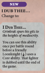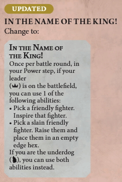 In the Name of the King! now requires you to use it in your own power step, not just any power step. This gives your opponent the opportunity to respond to a raised or inspired fighter before receiving a Gristlewel shaped missile to the face.