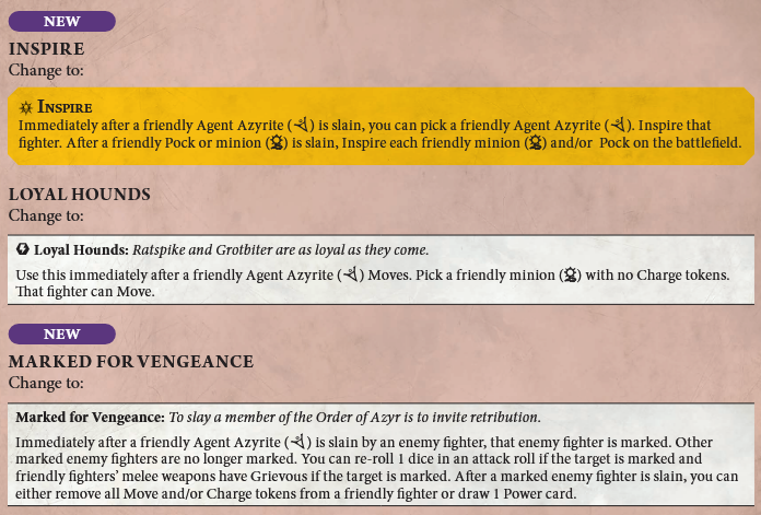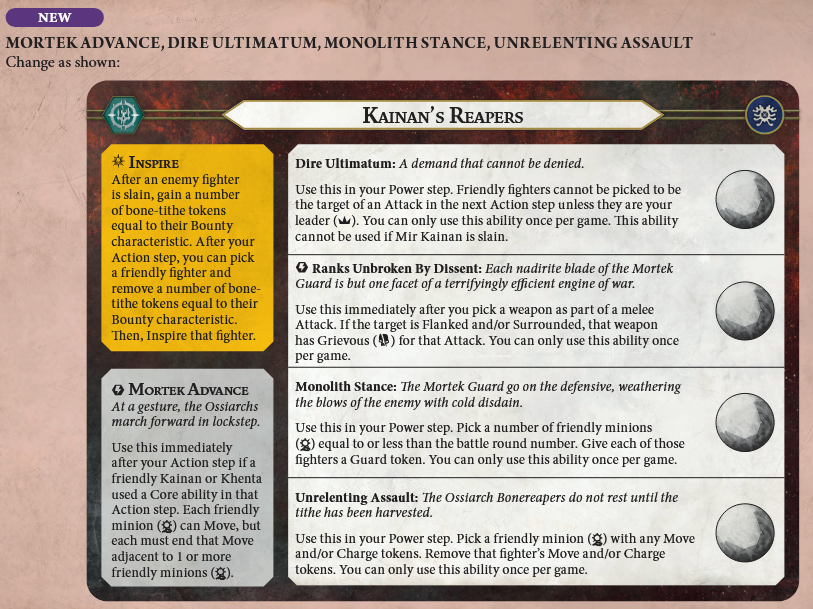 Unrelenting Assault received some slight timing updates. Previously, they were all written to "use immediately after your action step" and now instead function like most warscroll abilities where you can use them at any point in your power step. This loosens up the timing restrictions and gives the Kainan player an opportunity to respond to the opponent's shenanigans in the power step. As I've mentioned many times before, I'm a big fan of making rules more consistent across the game system.