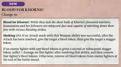 Foretold Slaughter is getting a facelift. Gone is the lackluster benefit of picking up critical grievous (seriously, does anyone enjoy critical grievous?) and instead the fighters are picking up the more useful and more thematic cleave and ensnare. I dig the flavor here in particular. If they're reading the future and seeing a successful attack coming, this actually changes the odds of the attack to make it more successful. It's also more universally useful – you'll always be able to pick between the two runemarks and guarantee they'll be part of your attack instead of merely hoping to roll a crit. The cherry on top means that the Knives of the Crone also wind up being extra threatening into the new Wurmspat, given their much easier time in turning off the Nurgle band's Disgustingly Resilient ability.