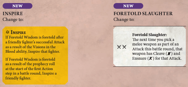 inspire criteria. Previously, only the Foretold Wisdom results from successful attacks would inspire your fighters, but now even the start-of-round prophecy roll has potential to inspire them. Since these fighters pick up some pretty substantial increases from inspiring, particularly increasing their fragile defensive profiles, this is a welcome update. It's also nice because it gives you the potential to inspire a fighter