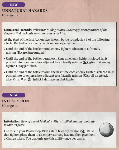 Unnatural Hazards, the menu ability where you pick one of three options but really only ever picked the first one because it was clearly the best, has been changed. Now each option can only be chosen once per game, meaning the Mollog player must choose when to turn on the absolute insane accuracy and also when to utilize the stagger and 50% chance ping. This is great. Mollog has gone through multiple iterations in second edition, but for some reason this ability has carried over each time. Now the entire warscroll will be used as well as reigning in the power level a bit.