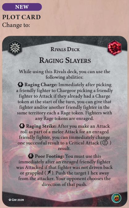 Raging Strike has been changed. Rage tokens no longer grant a re-roll for attacks. Instead, they allow you to change one of your successful rolls into a critical hit. This is quite a shift, because previously Raging Slayers was taken to increase the accuracy of warbands that needed a boost. Now it does nothing to help with accuracy, but instead can be used to more reliably deny Stand Fast, trigger your own Overrun, enable critical runemarks (Skinnerkin players, take note!), and do other fun things with critical attack results (more easily inspired Ironsoul's Condemnors, for instance). No way around it, this is a big nerf, but it's balanced out by how the rest of the deck is actually useful now and not just a tax to have a good plot card.