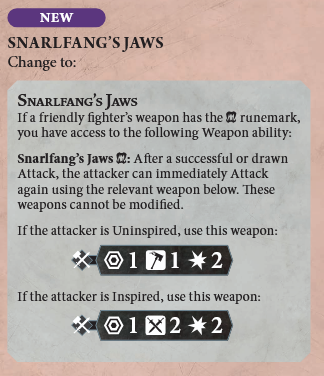 Quick Nibble, the warband's heal, was frankly kind of ridiculous as it was. Previously, it could be used in every power step of the game meaning the warband could theoretically heal 24 times. It's been toned down to only work in your opponent's power step, so there are "only" 12 instances of healing potential now. That's still a ton and the warband remains abnormally capable of healing their own fighters… provided they have haunches and don't die in one hit.