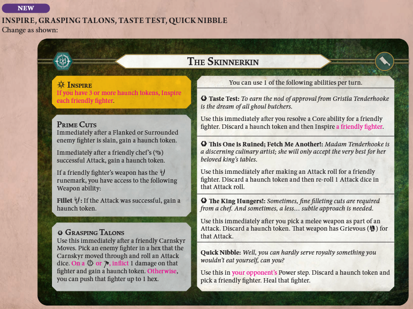 inspire condition has been downgraded slightly in what I assume is an effort to make it easier to track. It used to be that they'd all inspire once the warband collected its third haunch token, regardless of whether they've been spent in the meantime, but now they'll instead inspire once you have three or more haunch tokens. There's less requirement to remember if you've spent any when you can just look down and count tokens, but this does mean the Skinnerkin player has to decide whether they want to invest hunks of meat into inspiring later or spend them now for some quick gains.