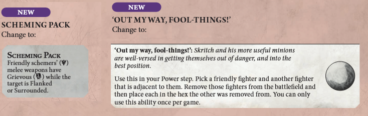 Out of my way, fool-things! has been changed. It used to be limited to only swapping friendly fighters which was an incredibly niche effect that felt kind of useless. You can still replicate the original effect, but you're also able to swap with an enemy which will be much more common. Use this to steal feature tokens, reposition enemies into unfavorable flanked positions, and just generally scheme like a backstabbing rat.
