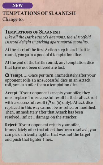Temptations of Slaanesh mechanic. The punishments for your opponent either accepting or rejecting the temptation dice have been flipped. Now, when you choose to offer a success on an opponent's attack roll, they can accept the success and have their fighter take a damage, or they can choose to reject the success and you push another of your fighters one hex. It also makes a lot more sense thematically, in my opinion.
