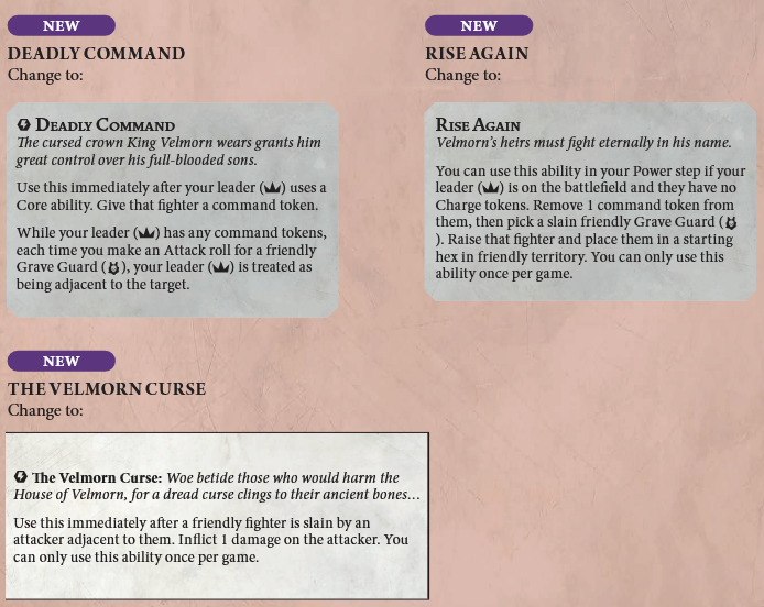 Rise Again is tweaked in a few ways. The biggest is that it's no longer a core ability and instead can be used in your power step like many of the other raise effects in the game. This continues the trend of removing activation taxes from this warband which is pretty cool. It's not all upsides, though, because now it's limited to one use per game and also no longer automatically replaces the command token that it spends when used. That last interaction always felt weird in that it required a command token, but using it just replaces the command token, so I won't mourn its removal.