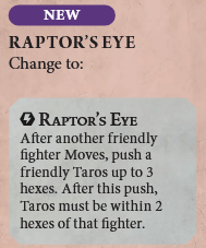 Raptor's Eye was previously a very restricted re-roll for attack dice, but now it's a positioning tool instead. A 3 hex push is quite substantial, and it's even usable multiple times in a round. Taros can be a handy pocket flanking buddy that can boost the accuracy and defense of the fighters in this warband even further or be used to run feature token interference while your Stormcast are out bashing heads in.