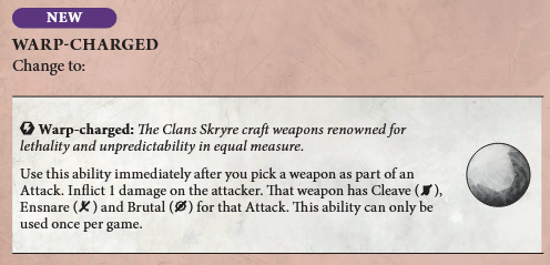Warp-charged that won't really change much about how Zikkit is played, but will at least make the play experience more reliable. The previous "sometimes 2, sometimes 0" damage mechanic was thematic for Clan Skryre inventions being unpredictable, but that doesn't make for good gameplay. Now, you'll always be able to plan around taking a single point of damage when activating this ability -- which isn't necessarily a downside, because you can then inspire one of your other fighters. Silver lining and all?