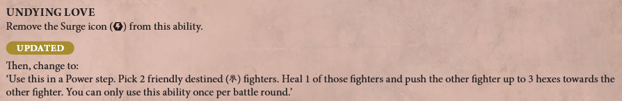 Undying Love was a solid tactical power to heal one of your main fighters while pushing the other a whopping 3 hexes towards them. Well it still does that, but now you can do it once per round instead of once per game. Given how much Zondara and Ferlain form the bulk of your useful fighters in this warband, being able to heal and push potentially three times can be quite helpful. If for no other reason, I know I'll be less inclined to sit on the ability and wait for the perfect moment to use it. Just fire it off as soon as it's remotely helpful, take advantage, and then get to use it again in the following round.